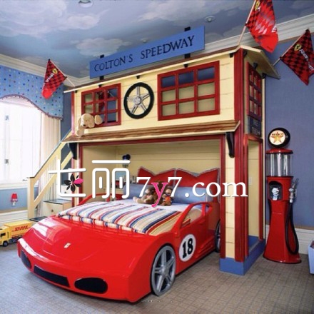儿童房间装修2:男孩子看到父亲开车觉得非常有男子气概,也像父亲一样。可以见房间装修成车库的模样,然后独家定制一张汽车床,炫酷到没朋友有没有。