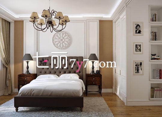 整个房间给人一种大气端庄质感,两个木质的对称高脚床头柜,古典优雅,配上复古的吊灯,低调而奢华。墙面上的凹位设计,具有强大的空间收纳功能,让洁白的墙壁增加不少亮点。
