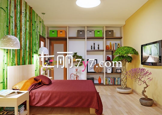 床头背景墙是绿色竹子图案,配上木质的地板和绿色植物盆栽,放佛置身于大自然中,夸张的色彩搭配,形成强烈的视觉冲击力。多个格子陈列架的混合色彩搭配,巧妙地装饰了墙壁,还尽显空间的收纳功能。