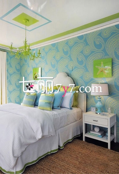 天蓝色与草绿色的搭配,给人一种别样的清新感。海洋生物的墙纸赋予空间淡淡的海洋气息。顶部的吊灯无论是款式还是色彩都跟墙纸很搭调。配上欧式风格的白色家具,增添了房间的整体性。