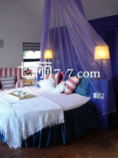 圆形双人床给人一种情调优雅的感觉,凸显出主人是一个追求浪漫热爱品质生活的人,用神秘的紫色纱幔笼罩下的睡眠区域,两盏暖色系的灯饰,分外温馨,让人格外有睡意哦。