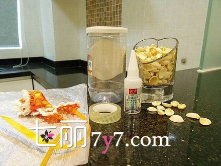 首先我们需要准备的物品有:吃出来的无数开心果壳、一个罐子(平时吃果真的那中罐子)、胶带、502胶水、塑料袋、彩带。准备就绪后,大家就跟着步骤来吧!