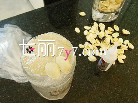 step1:大家准备好东西以后,将塑料袋套在罐子上,然后将大个的开心果壳沾上502胶水,一个一个围成圈粘在塑料袋上。