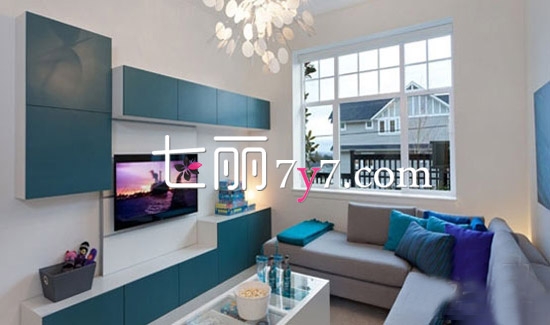 蓝色方形柜随意组合,高低错落,却规划的很合理,为空间增添了不少层次感,使其变得更加温馨有爱。在柜子上摆放装饰物及书籍,还加强了空间的收纳功能,做到时尚与实用兼备。