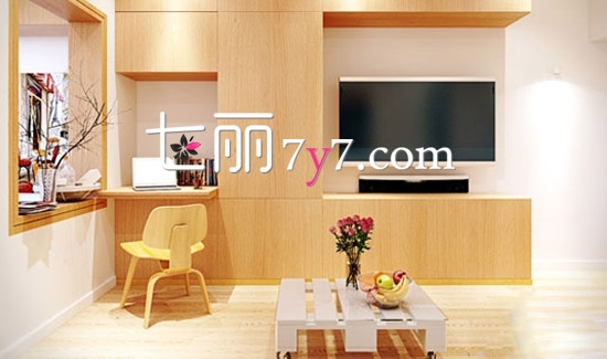 电视上方安置了两块木板作为置物架,简单的摆放上装饰物,十分温馨有爱,增加空间收纳的同时还美化墙壁。电视下方的矮柜,不仅可以放置电视机,还可以放置装饰品和书籍等,实用性极强,凸显空间格调。