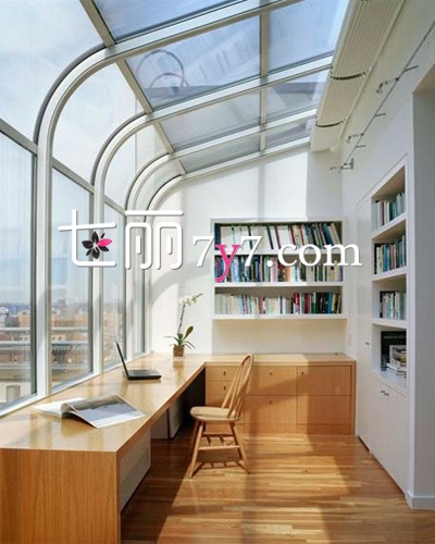 将露台阳光房设计成一个狭长型的书房,是很不错的选择,大面积的玻璃窗,采光效果自然是不用说啦。房间的布置按照普通的室内书房而设,转角大书桌贴合着墙角延伸,墙壁则设计为入壁式书架,简单而实用。
