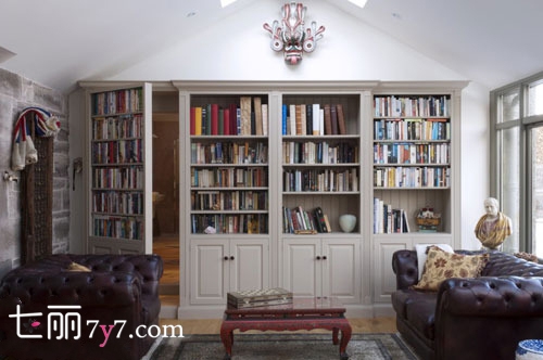 整个墙面使用多宝格展柜来装饰墙壁,木架上可以摆放自己的书籍、收藏物品,多宝格的设计让人傻傻分不清楚究竟哪一个才是暗门。这个书柜藏身在整个书柜里面,可以通向另一个房间,让隐形门形成整体效果,住家者更有私人空间,享受自己忙碌一天后的惬意时光。