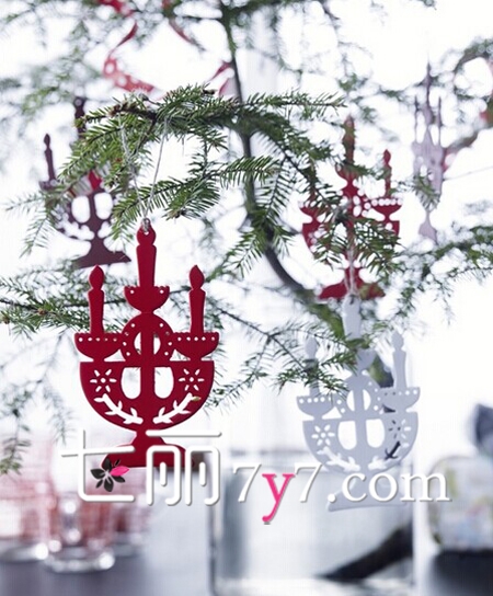 圣诞节怎么少得了圣诞树,但是餐桌上明显放不下圣诞树,所以使用枝形烛台、以及一些悬挂饰物,主题色彩为红与绿,轻松营造出圣诞欢快的氛围。