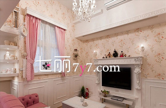 简约时尚的白色调,呈现出欧美风格,配上淡雅粉嫩的碎花壁纸,让空间变得浪漫梦幻,打造出甜美公主房的形象。电视上海设计了陈列架,巧妙地装饰了墙壁,大大的提升了空间的立体感。