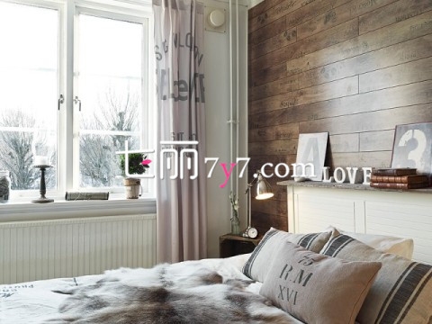 卧室的墙壁很有创意的将木地板搬了上去,与之对应的是两个做旧的木质的床头柜。窗帘采用个性字母印刷图案,现代感十足。床同样采用灰白颜色,有种置身北欧冰雪王国的感觉。