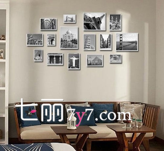 15个相框的摆放设计,与沙发的尺寸刚刚好,极为简单的白色相框,搭配黑白的照片,演绎出一种怀旧的风格,同时也让人一进客厅就能感受到居住者的喜好和品味。