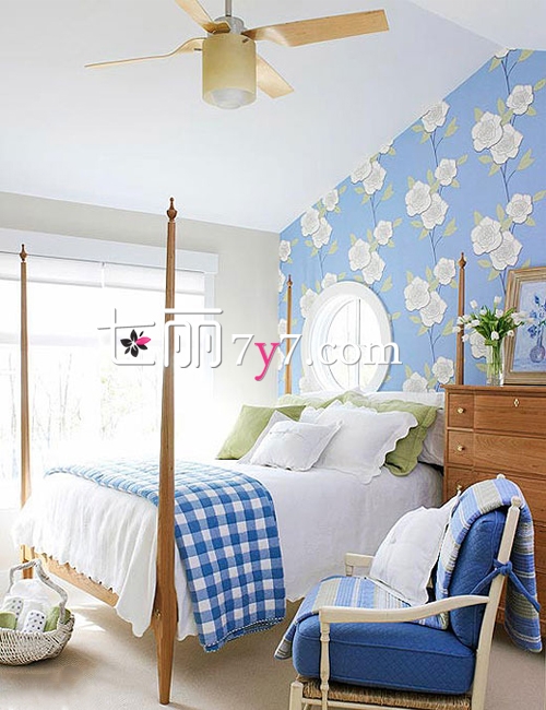 一眼望去,卧室中最醒目亮眼的,无疑是床头背景墙了,蓝底白花的墙纸,唯美浪漫,小圆窗非常有个性,不仅增加了采光度,更是为空间带来时尚美感。空间中配合了稍许的绿色掺入自然,加上其它白色布艺与极好的落地窗采光,让小卧室明朗而清新。