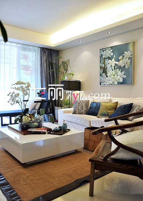 这款客厅空间给人一种特别舒适休闲的感觉。简单的吊顶设计与家具摆设,使空间显得极为恬逸,白色沙发与白色茶几在这一空间中相辅相成,沙发背景墙面上的花朵元素的装饰画,和厅内的植物让客厅内充满了清新素雅的感觉。