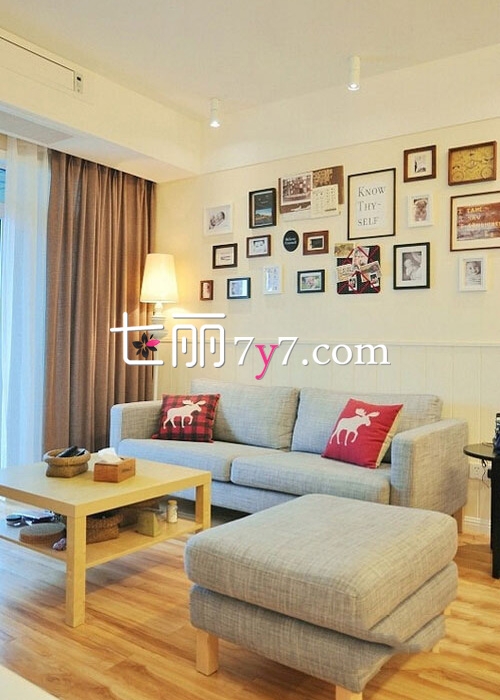 沙发背景墙设计成了照片墙,大小不一的相框让整个墙面都显出一份丰富的装饰感。灰白色的沙发配上原木茶几,简约舒适,让整个空间显露出简约的格调,就是这般简简单单的温馨。