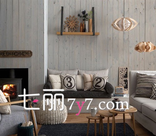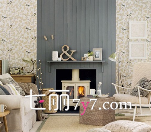 深灰色的墙壁和生动的壁纸,让整个客厅呈现出一种乡村风格的客厅,而木质的家具则让你身处在一个更舒适环境中,复古木质的壁炉在寒冷的冬天给整个客厅带来足够的温暖。