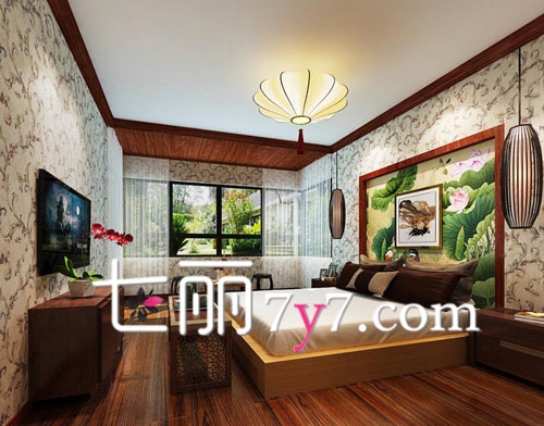 如果家居是中式或新中式的装修风格,那就尝试这款卧室背景墙的设计,古色古香的水墨画,搭配红木板材家具,能为中式家的古典韵味作点缀。