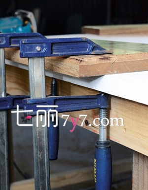 diy步骤七:然后用工具将砧板固定在桌子上。