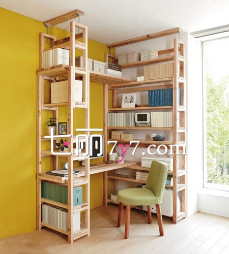 黄色的墙面,原木书桌架,绿色座椅,色彩搭配得非常巧妙。这样的定制书桌架很好的规划,节省了不少空间,不仅能收纳大量的书籍,还很方便拿取。完美的色调搭配让淡淡的空间充满了动感和活力。