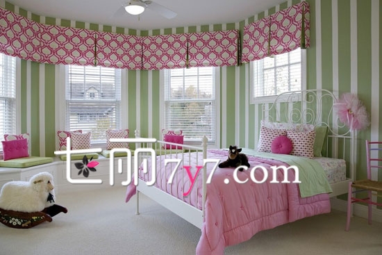 儿童房设计欣赏:摒弃传统样板间式的奢华炫目,以粉色为主的色彩作为主色调,再加上绿色的搭配,简约但不简单,凸显出美国人最爱的粉色调,加上陈设都是一应俱全,让这样的小女孩房间变得极为可爱。
