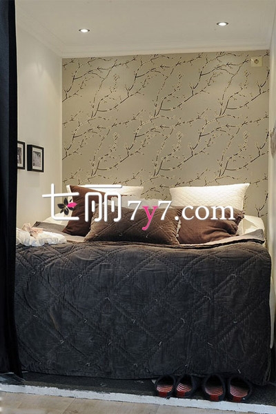 窄长型的卧室,摆放一张床刚刚好,床头背景墙采用暗沉的浅色系印花墙纸,恰到好处的中和了床品的色调。整个暗色调的的空间多了份沉静,易于安眠。软隔断的设计,让卧房的开放度可以自由把控。一旁挂上装饰画,增添温馨感。