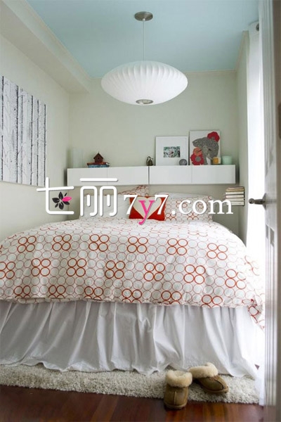 同样是窄长型的空间,也是刚刚好摆放一张床的宽度,高高的床铺给人一种非常柔软温馨的感觉。白色的运用让小空间在视觉上得以膨胀,不会觉得压抑憋闷。床头的置物箱既美化了环境又非常使用。