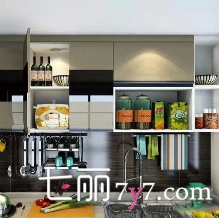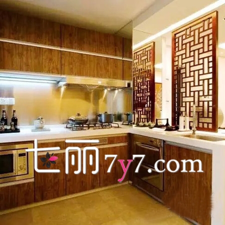 原本最简单实木的设计,显得有些单调和俗气,但是有了水墨画作装饰和中式镂空花窗作隔断,对于这些多出来的传统文化植入,显得厨房立即与众不同起来,同时中国味十足。