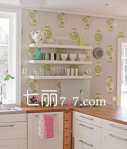 不想涮太多的油漆,那么就试试贴上墙纸吧,既省心又省钱,小厨房不会用到太多,却可以让其美丽出挑。配上白色与木色的北欧风情来装饰的白色厨房,很适合小资女们的无比清新自然的氛围。
