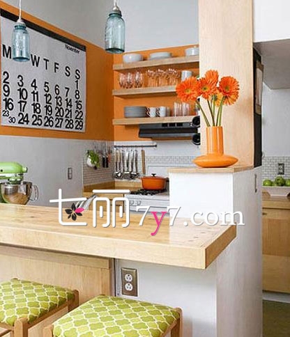 装修不但要讲究品质,更要讲究实用和省钱,对于小资女们来说,颜色的呼应让爱窝更具设计品质。在这个几平米大的小厨房,格局的布置可谓做到了精致,外侧吧台的设计,最是让人称赞。背景墙用上橙色部分,格外活跃,配上挂历,橙色正好与外侧摆放的橙色花盆与橙色葵花所呼应,缔造出无与伦比的美丽。