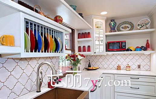 很多老旧式的厨房,大部分都是简约的黑白色为主。如果是单身居住的小资女们,建议在购买厨房用具时,可尽量选用亮丽的糖果色,当他们露在外面时,就是极具趣味的装饰了厨房。像案例中,挂壁式碟架,将五颜六色的盘子魅力展示,可爱无比,让人一看去心情就变得很好。