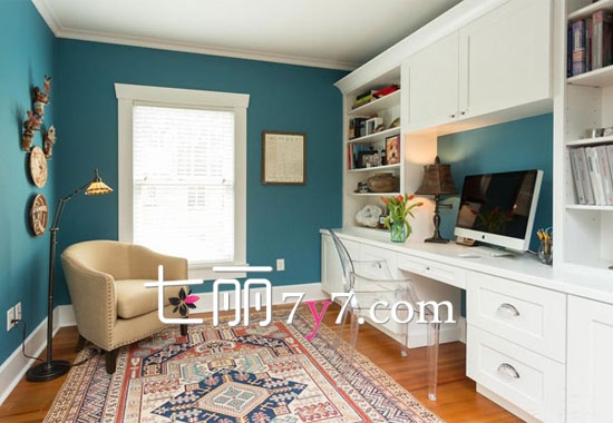 蓝色的墙面,给人一种异域风情。配上复古多彩的印花地毯,神秘浪漫独具风情。一面墙设计了大大的白色书桌柜,收纳和展示功能划分清晰。书桌旁的白色百叶窗,简约明亮。现代感设计的透明椅子设置更显舒适悠闲。
