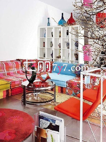 这间客厅设计极具民族风特色。红色系格纹布艺沙发,在白色的墙面和置物架的衬托下,显得尤为抢眼,光洁的地面则让这一客厅看上去整洁干净,在角落摆放上一株植物作为空间点缀也是不错的选择哦。