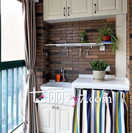 如果还洗衣机长时间不用会起灰尘,不如就放在阳台上,不但节省了很多没必要的空间,旁边加上一些小水池,在清洗时也方便,在墙面上置上几盆植物,整个阳光也会变得绿意葱葱的。