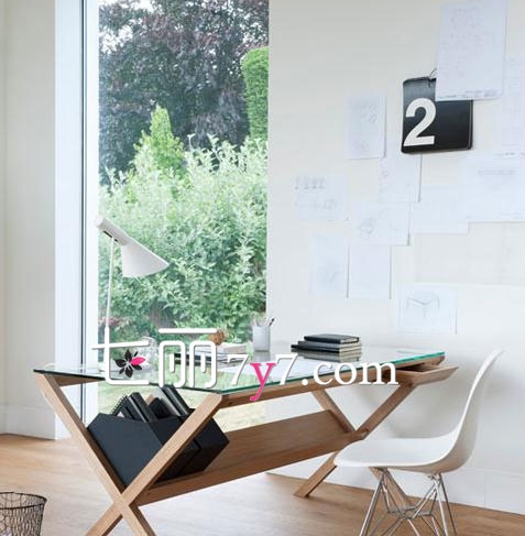 书房改变以往老旧式的风格,半开放式的,用玻璃的桌面以及旁边玻璃的窗户,这样在阅读书籍困倦时,停下来看看窗外的风景,也是一桩美事!加上色彩的用色,让整个房间很是简约,又不失清新的味道。