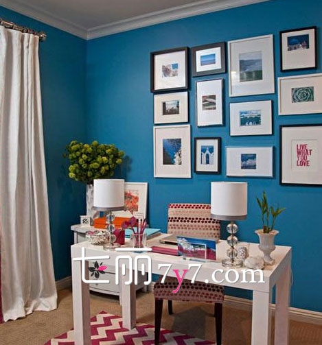 书房其实也是个休息的场所,结束外面一天的工作后,在这里看些修生养性的书籍,安慰不安份的情绪,用蓝色的背景墙以及条纹地毯的设计,瞬间让会恢复不少的活力,当然了也是家庭中不能缺少的一部分。