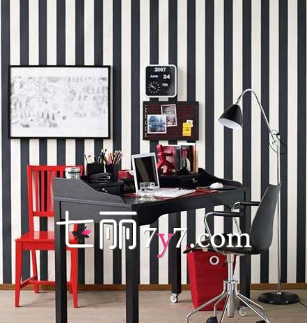 要是简约,又不失大气,那么黑白简约大气一定不能少,以条纹的形式出现在背景墙的浓墨重彩,能瞬间提升整个空间的活跃度,也让整个工作中充满了激情,特别是红色的椅子,瞬间提亮了整个简约风格空间的亮点,如果是创意工作室,建议可以试试!
