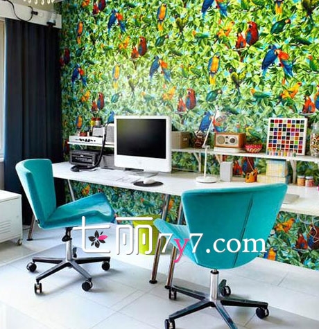 绿意葱葱的背景墙,虽颜色较重,但能营造出一种稳重的感觉,赶走了沉闷和阴暗,加上一些小清新的家居,让简约大气的书房,变得不那么枯燥,嫩一把的形式,还能赶走工作的疲劳哟!