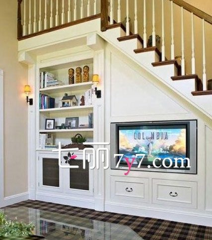 在复式楼的楼梯下方,摆放一台电视,谁会想得到呢?这不但让墙面摇身一变,又能让多余剩下出来的空间利用起来,还不占地方,下面的储物柜还能放下不少的小物件,电视旁的书架设计也是相当实用。