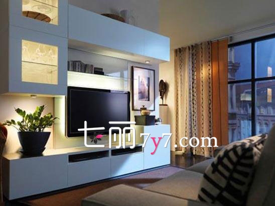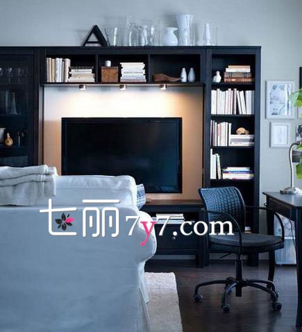 很是宜家的电视背景墙装修效果,不但实用还要能多重收纳物品,图片上这款设计,黑色的柜子,而电视背景采用了白色,顶部的吸顶灯照射的暖色调使整个感觉不显沉闷反倒赋予了设计感在里面。
