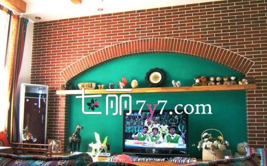 欧式复古的客厅中,壁炉是一个焦点,图片上这种设计正好运用了小砖头的质感,加以用老榆木原木制做的电视柜给空间营造深远的感觉,复古的湖绿色以及橘红色小砖让整个电视背景墙,吐露出别样的复古经典味道。