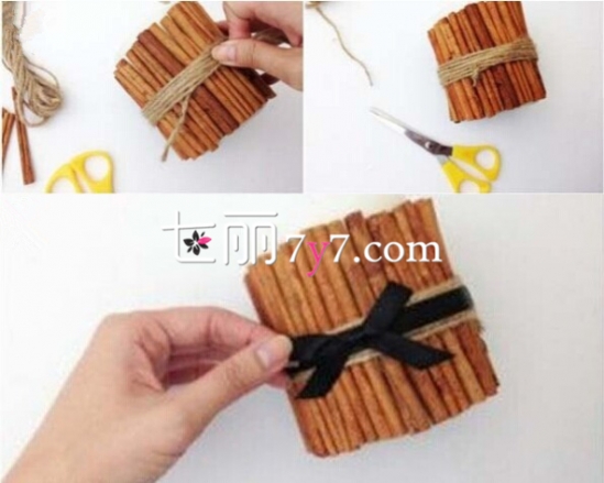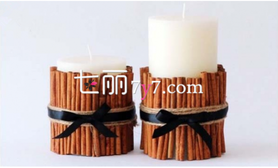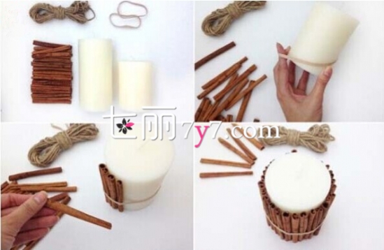 我们要准备木枝,麻绳,和2个橡皮筋。将木枝剪成长短相同,然后围着蜡烛周围放置,用皮套的张力将树枝固定就好,是不是很简单呢?