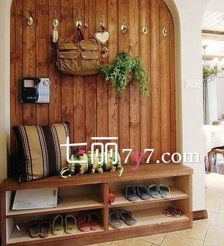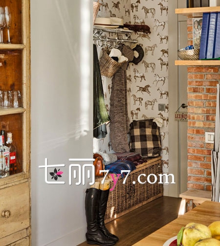 玄关本身是个很空旷的地方,如果你有随意乱放东西的习惯,不妨试着将玄关也搁置出一种乱七八糟的感觉,图中这种很有田园风的玄关设计,见招拆招建玄关,别看玄关小,杂七杂八功能大。虽杂乱,但有一种家的温馨感。