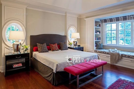 对于梦想拥有飘窗的你来说,飘窗就是一个新的天地,有些复古的卧室设计,加上深色系的飘窗设计,窗台上摆放坐垫和靠枕,让它成为一个多功能休闲区域,真是超有feel,让给卧室更显浪漫情调。