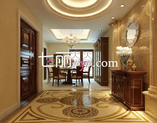 建材运用——(1)大理石与地板,采用石材进行铺设显得大气。若是普通居室,客厅与餐厅最好还是铺设木质地板;(2)多彩和精美的织物、毛毯,柔软的织物与毛毯是欧式风格的重要材质表现;(3)有特色的精致印花图案墙纸,另外如画有圣经故事以及人物等内容的墙纸也是典型的欧式风格建材。