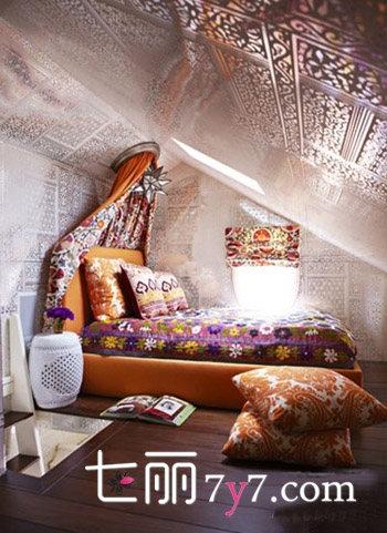 将一间让人不喜欢的狭小的阁楼样式,打造成一个现代浪漫少女的房间,增加了天蓝,把墙纸刷在了聚酯薄膜上,用于反射周围的光,而卧室的个性墙纸,更是十分精致,加上一些亮色系的床用和饰品点缀,让这件房立即变得有趣起来。