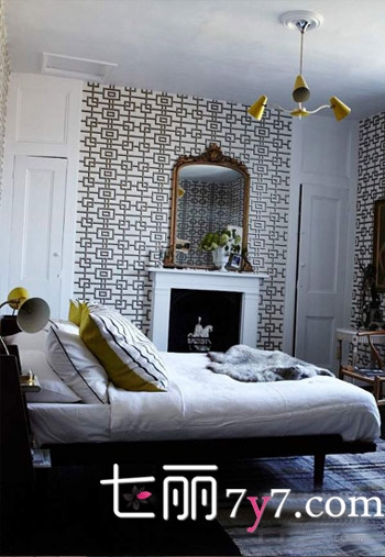简单的黄色小吊灯,温馨惬意,壁炉上方,镶以金属框架的镜子,加上以黑白为主,亮色做点缀的装修风格,使得卧室同样富有高贵的气息,以及展现出个人的品味。