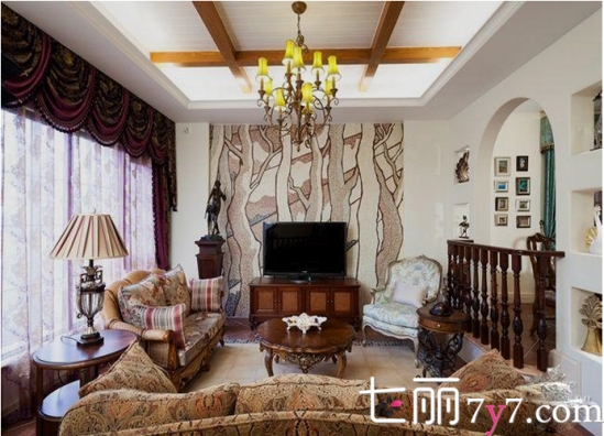 具有古典复古气息的欧式风格客厅装修效果图,民族风的沙发加上黄色吊灯使整个客厅具有复古的生活气息,加上木质的围栏,更具古典气息。