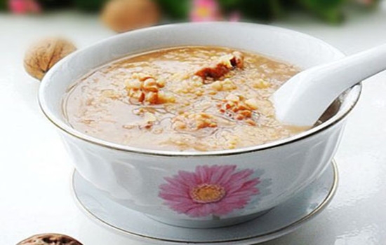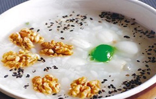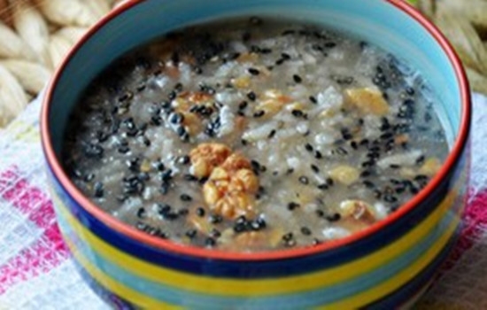 制法:将捣碎的核桃仁、炒香的黑芝麻与淘洗干净的大米同放入锅中,加入适量的清水煮成粥,撒入白糖调匀即成。