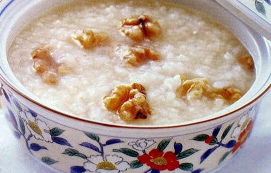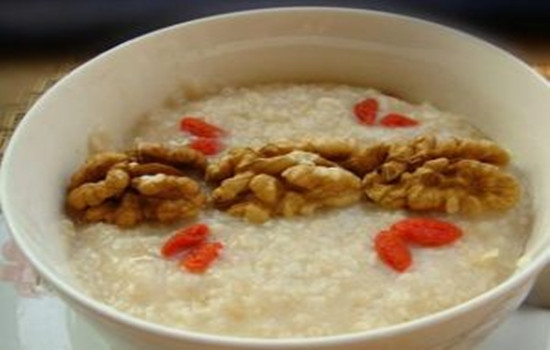 做法:将核桃仁洗净,捣成碎末,枸杞子、糯米淘洗干净。将核桃碎末、枸杞子、糯米放入锅内,加入适量清水,待煮沸后,改用小火煮成稠粥,加入白糖调味即可。