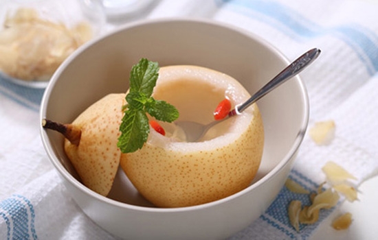 做法:将干净的罗汉果一个、雪梨两个放进砂锅中,加入干净水,放在火上,先用大火,待其开锅后,改微火,煮20~30分钟,将水沥干,待其温度适宜,即可饮用。
