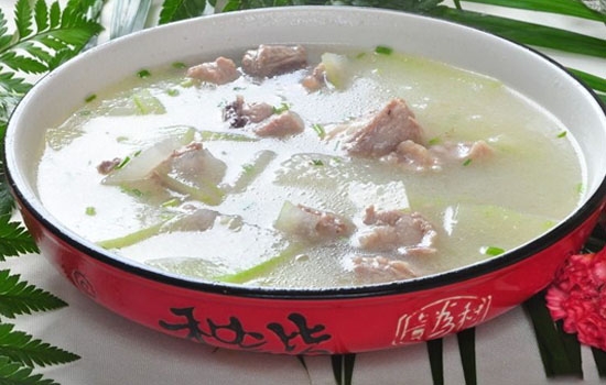 做法:排骨斩成小块,冬瓜去皮切小块。把排骨放在开水锅中烫五分钟,捞出用清水洗净。将排骨、姜、大料和适量清水,上旺火煮沸,再改小火炖一个小时左右,接着放入冬瓜炖20分钟,捞出姜块、大料,再加盐、胡椒粉、味精起锅即可。